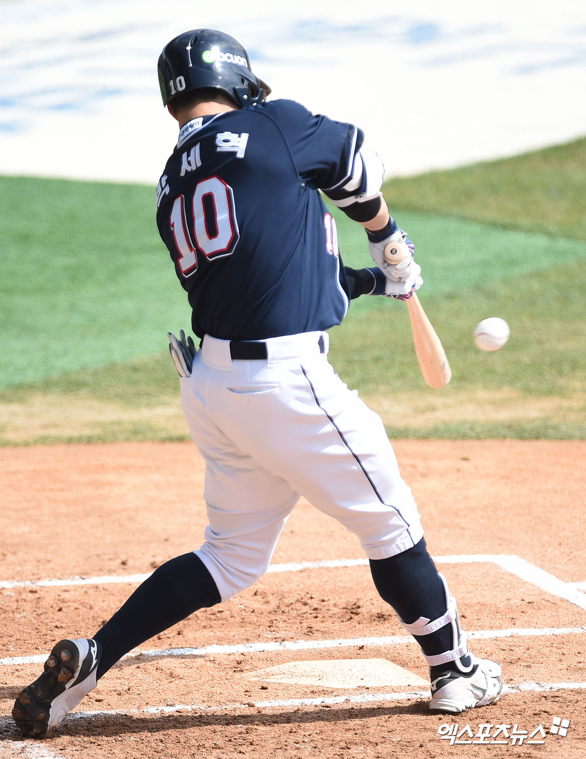 [엑스포츠뉴스 잠실, 김한준 기자] 27일 오후 서울 송파구 잠실야구장에서 열린 두산 베어스 청백전 경기, 2회초 두산 박세혁이 타격을 하고 있다. 결과는 우익수 플라이 아웃.