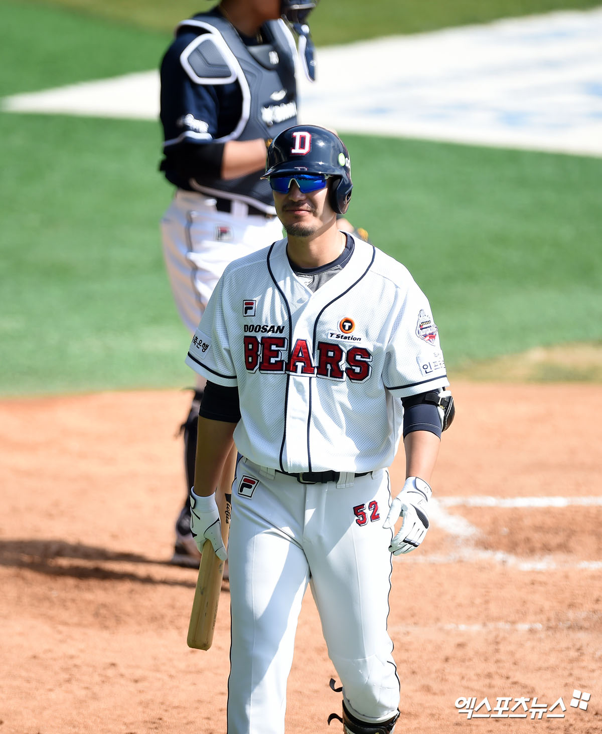 [엑스포츠뉴스 잠실, 김한준 기자] 27일 오후 서울 송파구 잠실야구장에서 열린 두산 베어스 청백전 경기, 3회말 1사 1루 두산 김재호가 루킹 삼진을 당한 후 더그아웃으로 향하고 있다.