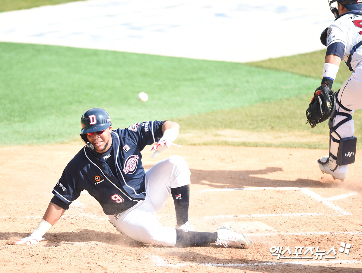 [엑스포츠뉴스 잠실, 김한준 기자] 27일 오후 서울 송파구 잠실야구장에서 열린 두산 베어스 청백전 경기, 4회초 2사 1,2루 두산 페르난데스가 박세혁의 2타점 3루타때 득점에 성공하고 있다.