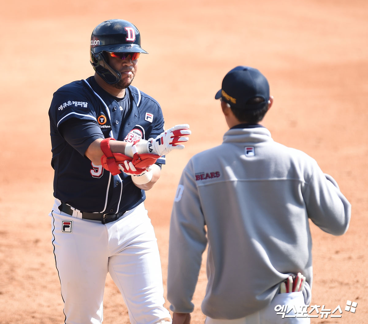 [엑스포츠뉴스 잠실, 김한준 기자] 27일 오후 서울 송파구 잠실야구장에서 열린 두산 베어스 청백전 경기, 5회초 2사 1,2루 두산 페르난데스가 1타점 적시타를 날린 후 하이파이브를 하고 있다.