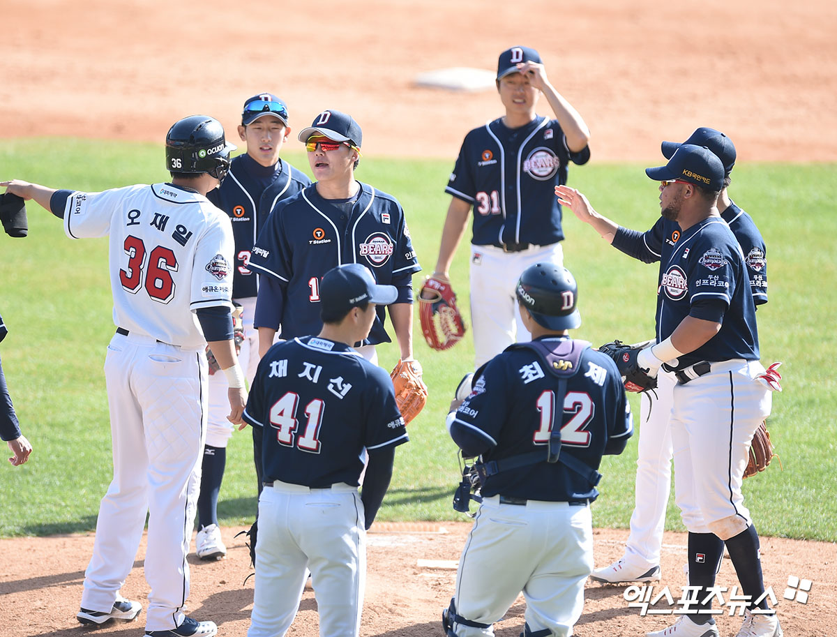 [엑스포츠뉴스 잠실, 김한준 기자] 27일 오후 서울 송파구 잠실야구장에서 열린 두산 베어스 청백전 경기, 청팀이 박세혁의 3타점에 힘입어 백팀에 5:1로 승리했다.