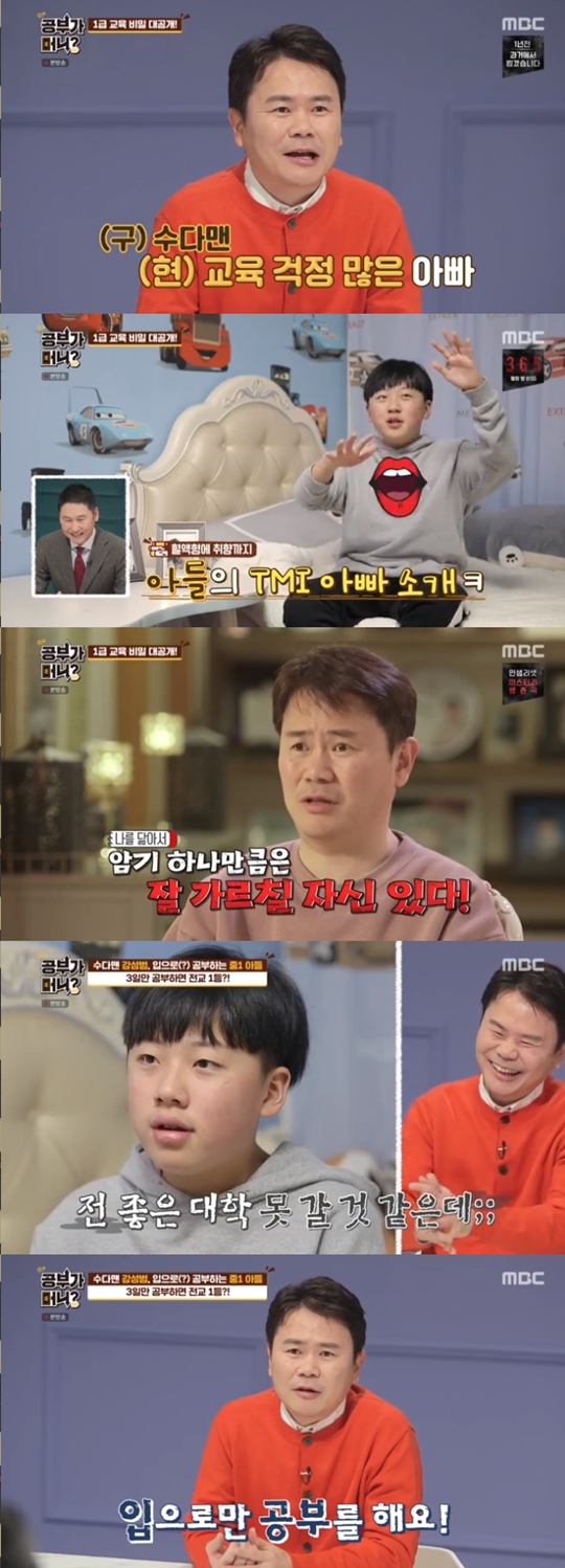 이후 강성범은 "아들이 입으로만 공부를 한다. 입으로는 전구 1등 몇 번 했다. 3일만 공부하면 된다고 한더라"라고 교육 고민을 털어놨다.
