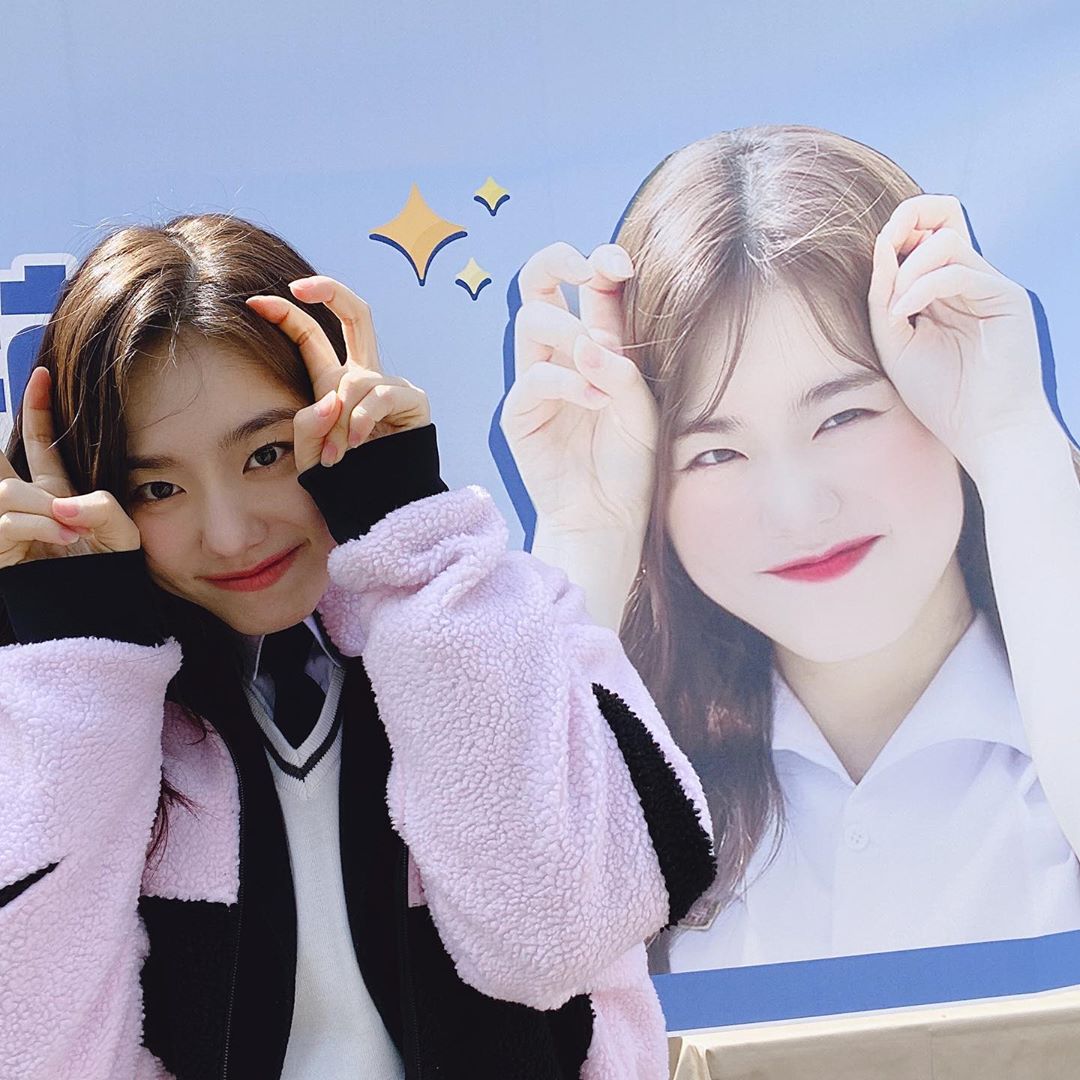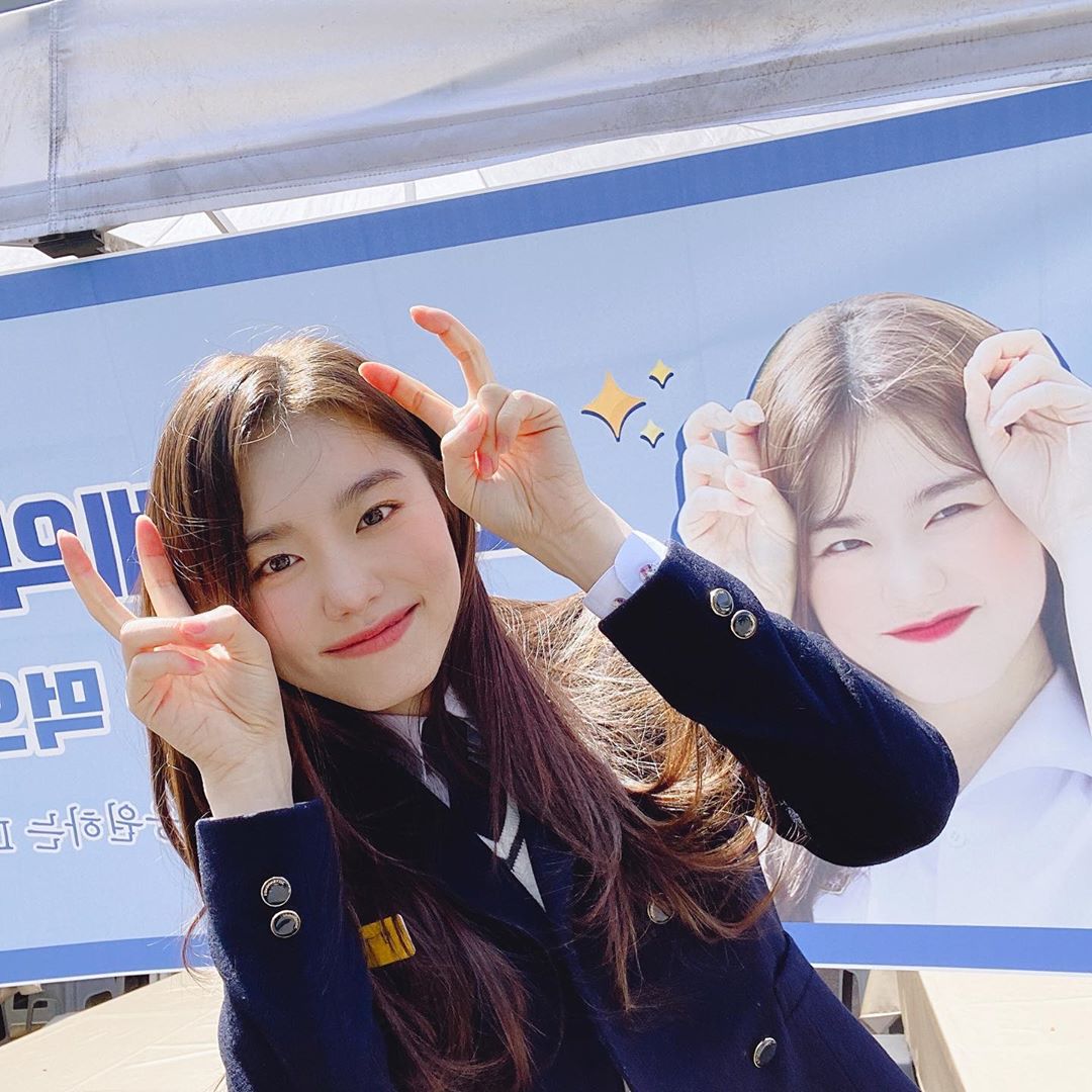 공개된 사진 속 김소혜는 팬들이 보낸 밥차 인증샷을 남기며 상큼 발랄한 매력을 뽐내고 있다. 김소혜는 현수막 뒤 자신의 사진을 따라하며 브이 포즈를 취하고 있다.