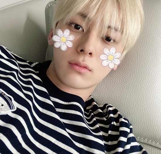 공개된 사진 속 줄무늬 티셔츠를 입고 카메라를 응시하는 황민현의 모습이 담겼다. 황민현은 카메라 어플을 사용해 두 볼에 귀여운 꽃을 달았다.