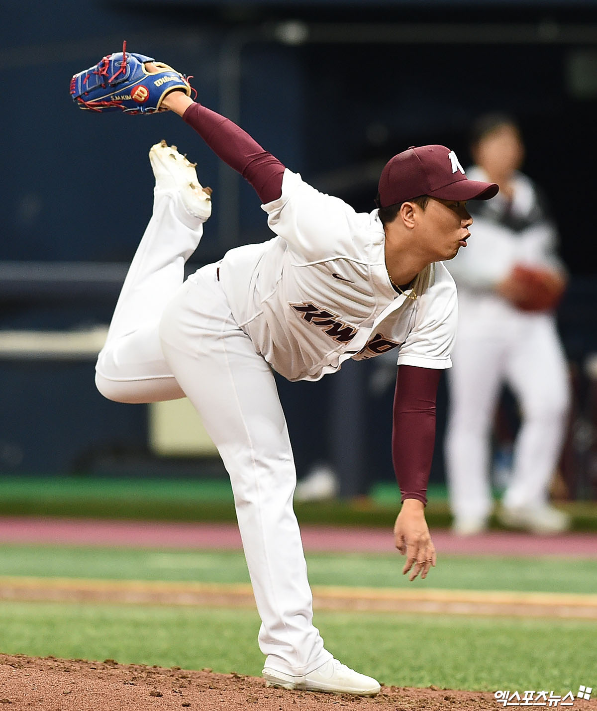 [엑스포츠뉴스 고척, 박지영 기자] 31일 오후 서울 구로구 고척스카이돔에서 진행된 키움 히어로즈 자체 청백전 경기, 7회초 백팀 김성민이 역투하고 있다.