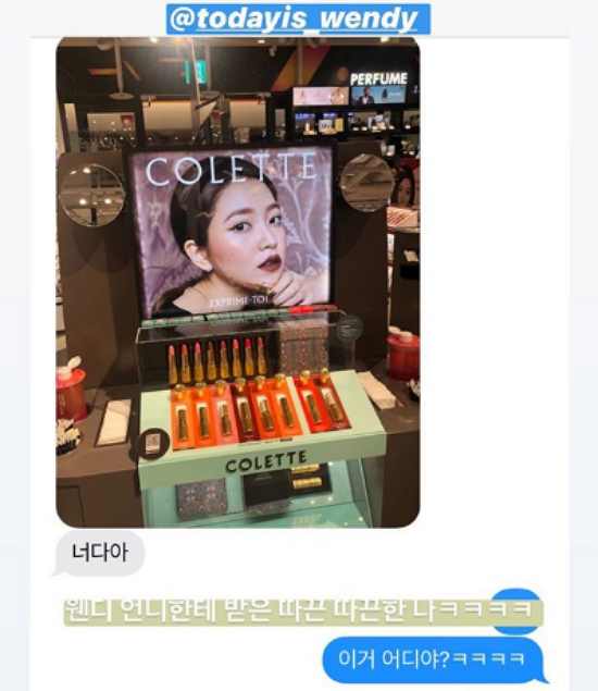 올라온 사진 속 웬디는 화장품 가게에 있는 웬디 광고판을 캡쳐해 "너다아"라고 예리에게 보냈다. 자신의 얼굴을 본 예리는 "이거 어디야?"라고 물었다.