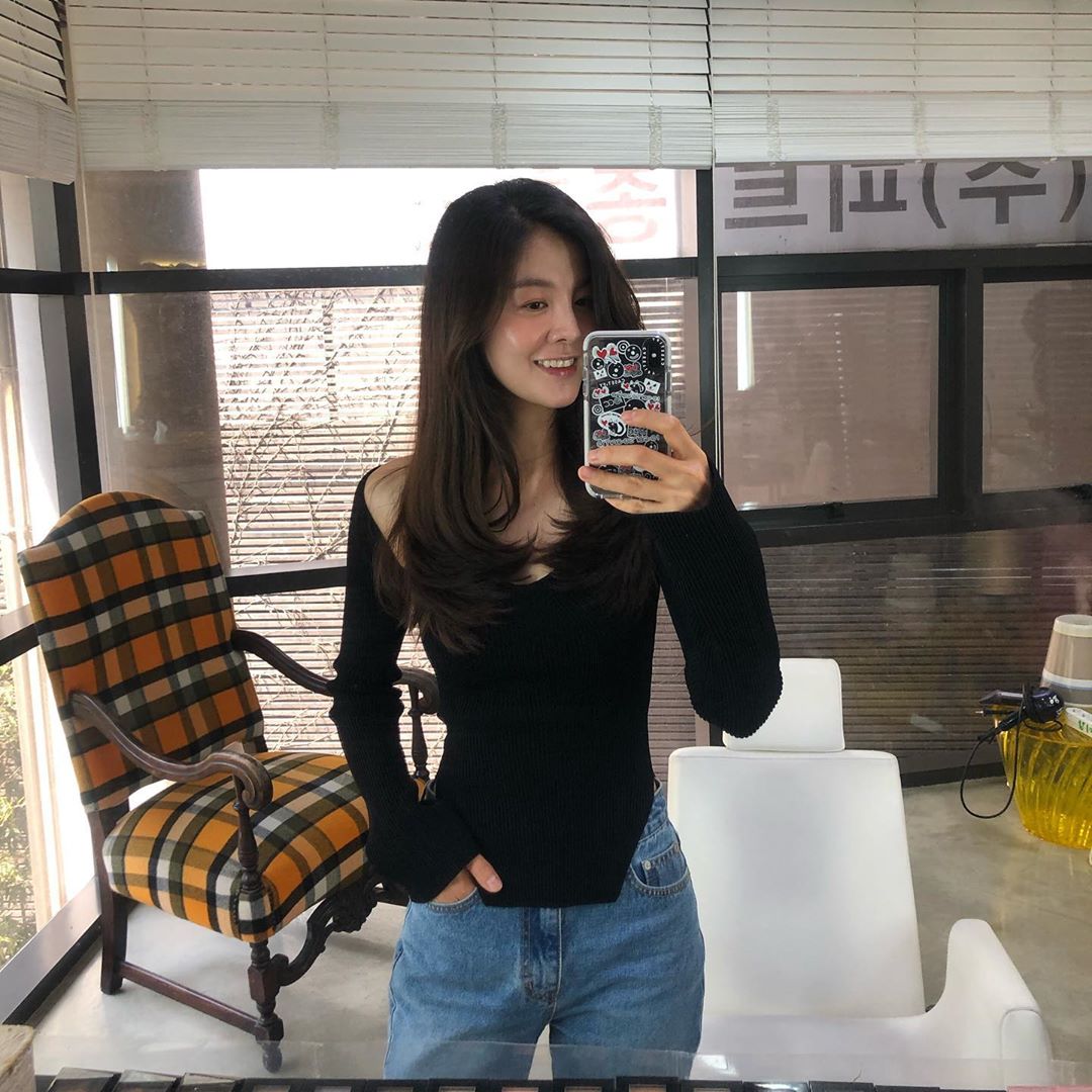 공개된 사진 속 김성은은 거울을 마주한 채 카메라를 응시하며 미소짓고 있다. 오프숄더와 청바지로 멋을 낸 김성은의 패션과 우아한 미소가 눈길을 끈다.