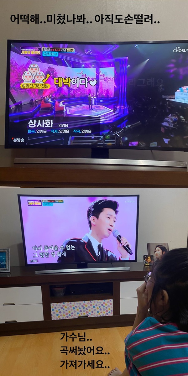 공개된 사진 속에는 '사랑의 콜센타'를 보고 있는 안예은의 모습이 담겼다. 16일 방송된 TV 조선 '사랑의 콜센타'에서 임영웅은 한 팬의 요청으로 안예은이 작사·작곡한 '상사화'를 열창했다.