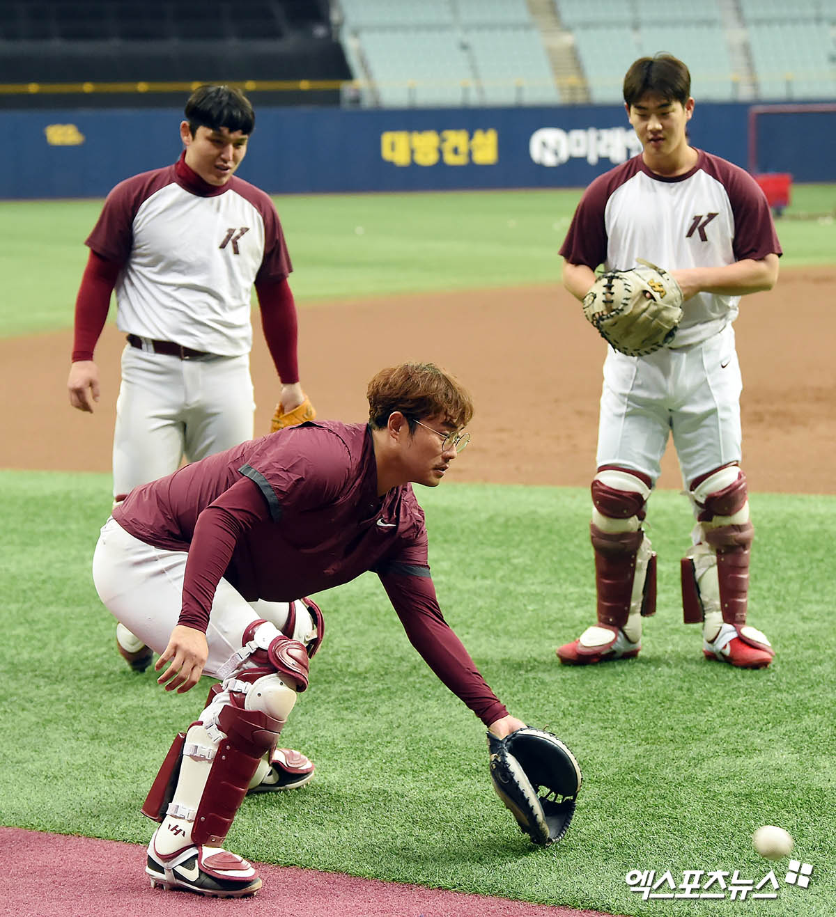 키움 이지영이 포수 수비 훈련을 하고 있다.