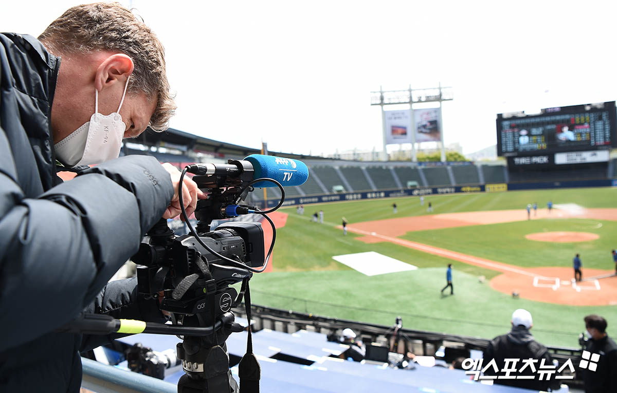 [엑스포츠뉴스 잠실, 윤다희 기자] 12일 오후 서울 송파구 잠실야구장에서 열리는 ‘2020 신한은행 SOL KBO 리그’ 두산 베어스와 LG 트윈스의 연습경기, 외신 기자가 취재를 하고 있다.