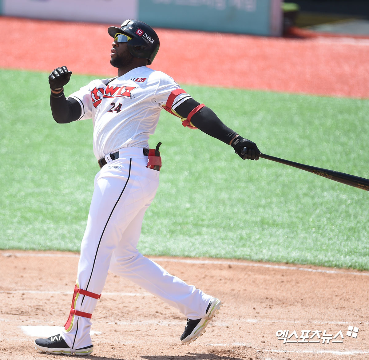 [엑스포츠뉴스 수원, 김한준 기자] 21일 오후 수원kt위즈파크에서 열린 ‘2020 신한은행 SOL KBO 리그’ 한화 이글스와 kt 위즈의 연습경기, 2회말 무사 1루 KT 로하스가 투런 홈런을 날리고 있다.