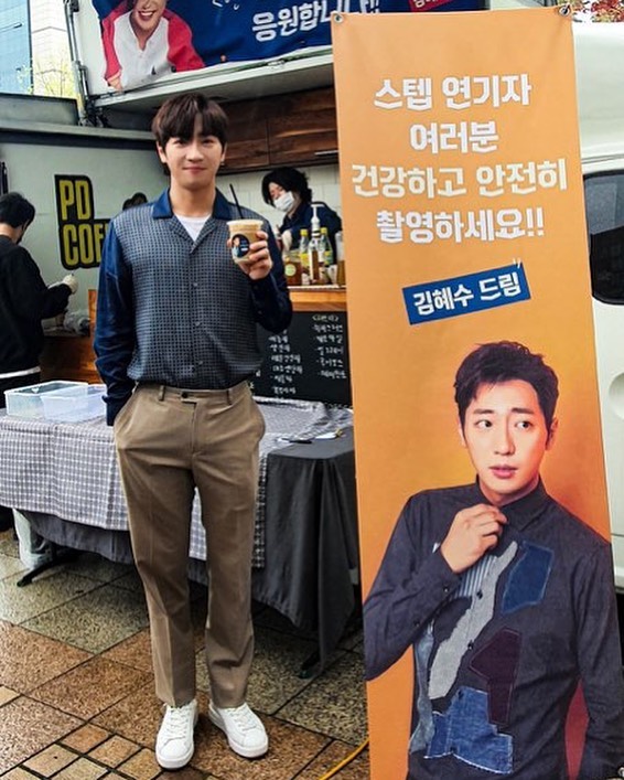 그의 뒤에는 김혜수가 보낸 커피차가 서있었다. 이상엽은 "스텝, 연기자 여러분 건강하고 안전히 촬영하세요! 김혜수 드림"이라는 문구가 적힌 판넬 앞에서 커피를 든 채 이를 인증했다.