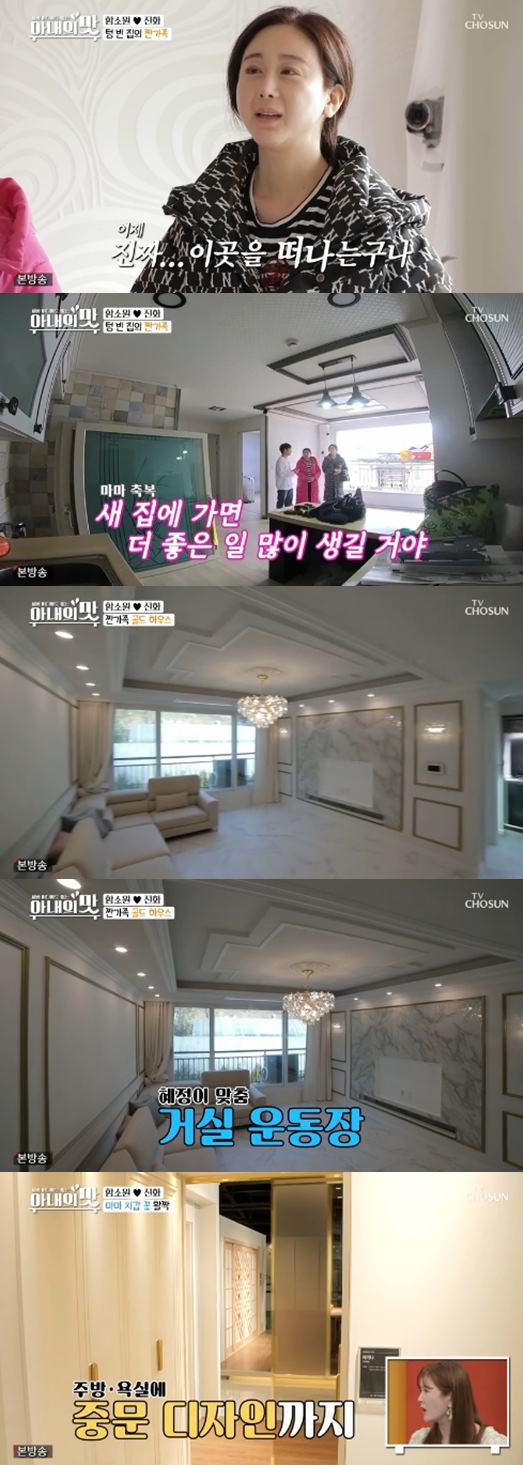 뒤이어 함소원, 진화 부부의 새 집이 공개됐다. 금색 문틀, 금색 손잡이, 금색 조명 등의 황금 인테리어가 눈길을 끌었고 운동장 같은 거실이 시선을 사로잡았다. 거실에서는 산이 한눈에 보였다.