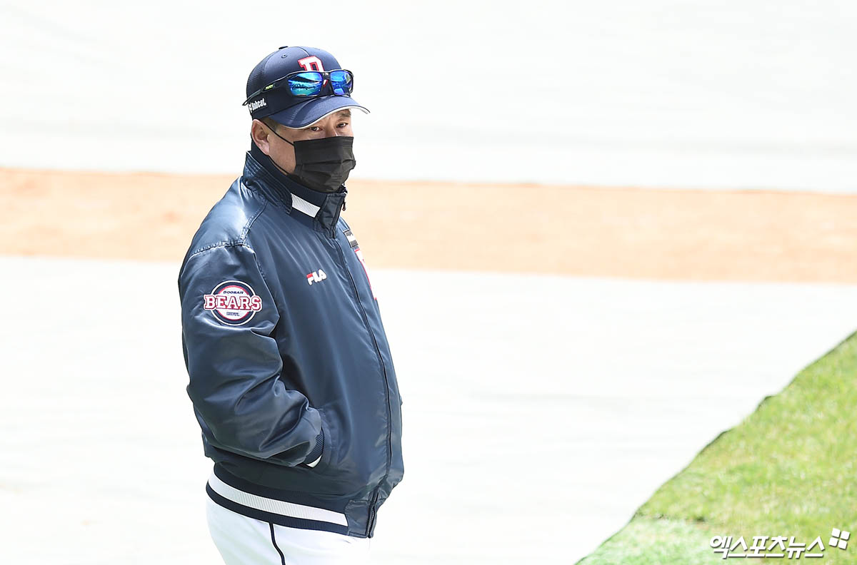 [엑스포츠뉴스 잠실, 박지영 기자] 22일 오후 서울 송파구 잠실야구장에서 열리는 '2020 신한은행 SOL KBO리그' 연습경기에 앞서 두산 김태형 감독이 그라운드에서 선수들의 훈련을 지켜보고 있다.