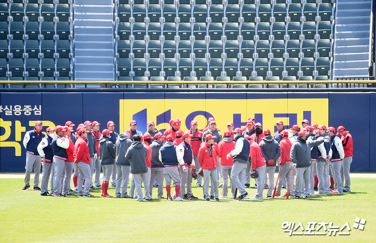 [엑스포츠뉴스 잠실, 윤다희 기자] 24일 오후 서울 송파구 잠실야구장에서 열리는 ‘2020 신한은행 SOL KBO 리그’ SK 와이번스와 LG 트윈스의 연습경기, SK 선수들과 코칭스태프들이 훈련을 하고 있다.