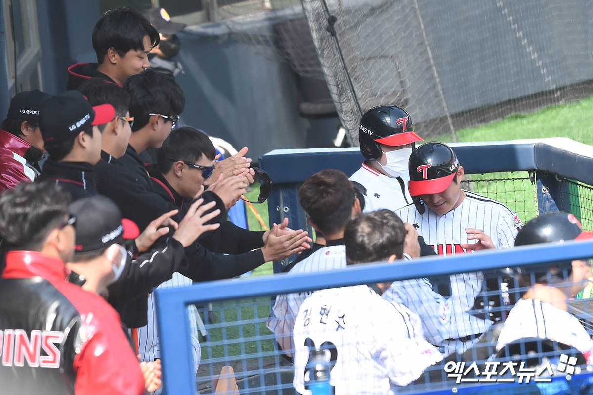 [엑스포츠뉴스 잠실, 윤다희 기자] 24일 오후 서울 송파구 잠실야구장에서 열린 ‘2020 신한은행 SOL KBO 리그’ SK 와이번스와 LG 트윈스의 연습경기, 5회말 무사 3루 LG 오지환 득점에 LG 선수들이 기뻐하고 있다.
