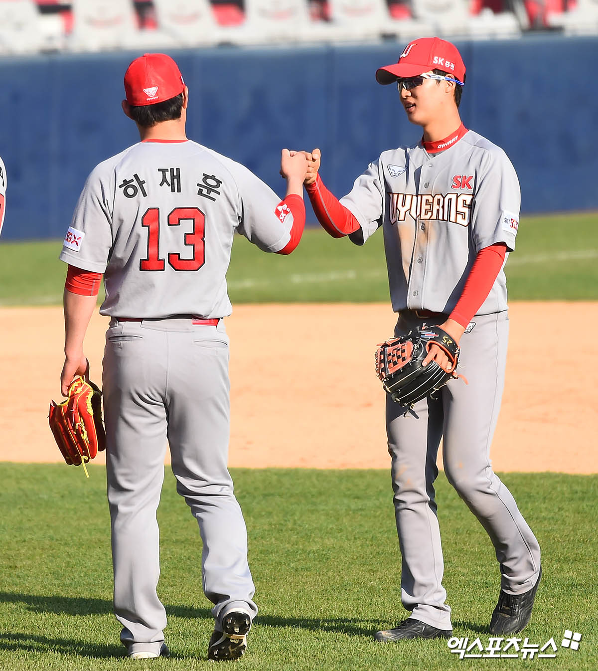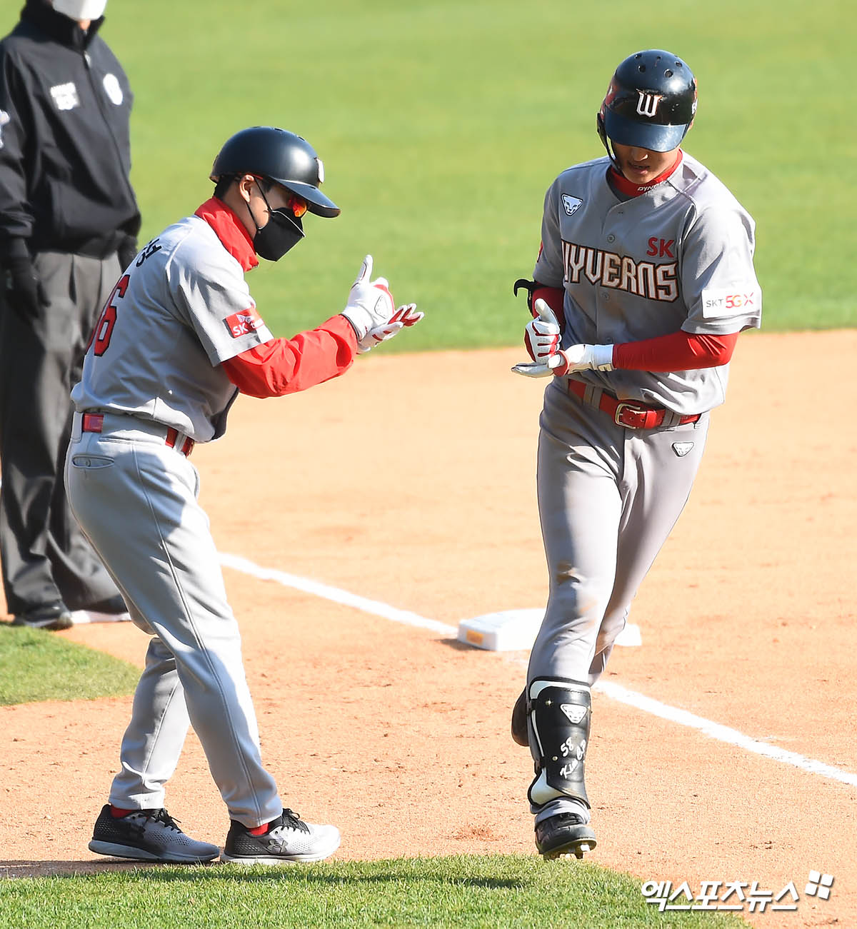 [엑스포츠뉴스 잠실, 조은혜 기자] SK 와이번스 김창평이 프로 데뷔 처음으로 홈런을 기록했다. 비공식 연습경기라는 것이 아쉬울 뿐이다.