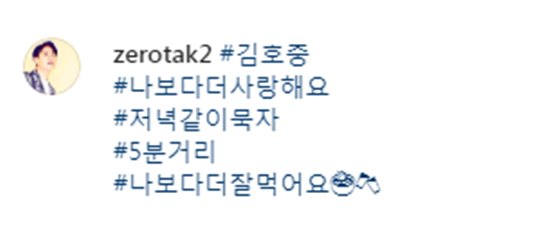 영탁은 28일 자신의 인스타그램 계정에 "#김호중 #나보다더사랑해요 #저녁같이묵자 #5분거리 #나보다더잘먹어요"라는 해시태그를 올려 김호중의 신곡을 응원했다.