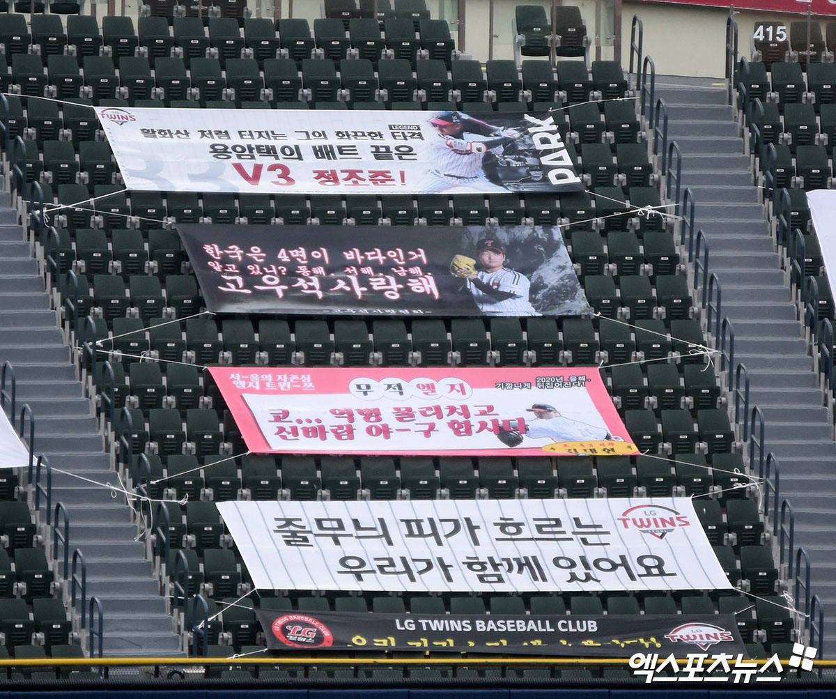 [엑스포츠뉴스 잠실, 김한준 기자] 5일 오후 서울 송파구 잠실야구장에서 열리는 ‘2020 신한은행 SOL KBO 리그’ 두산 베어스와 LG 트윈스의 개막전 경기, 외야 관중석에 팬들의 응원문구가 적힌 현수막이 설치되어 있다.