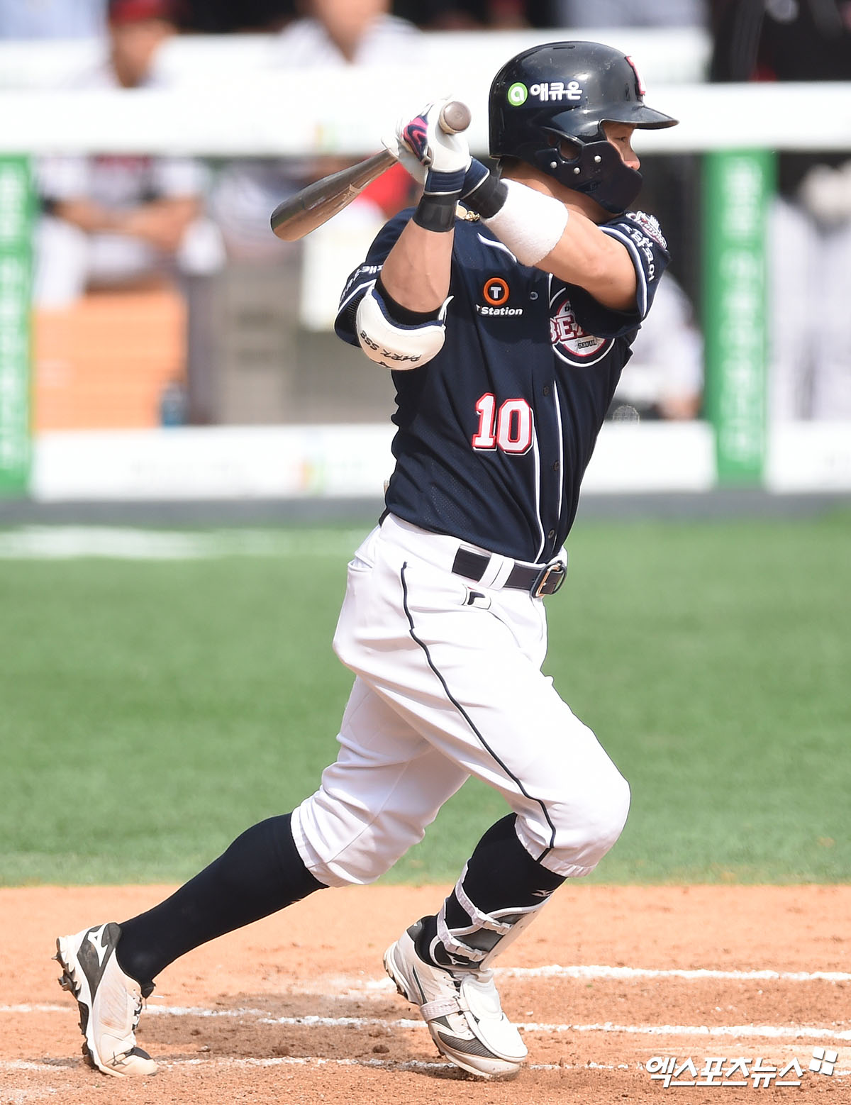[엑스포츠뉴스 잠실, 김한준 기자] 5일 오후 서울 송파구 잠실야구장에서 열린 ‘2020 신한은행 SOL KBO 리그’ 두산 베어스와 LG 트윈스의 개막전 경기, 7회초 1사 1루 두산 박세혁이 중전안타를 날리고 있다.