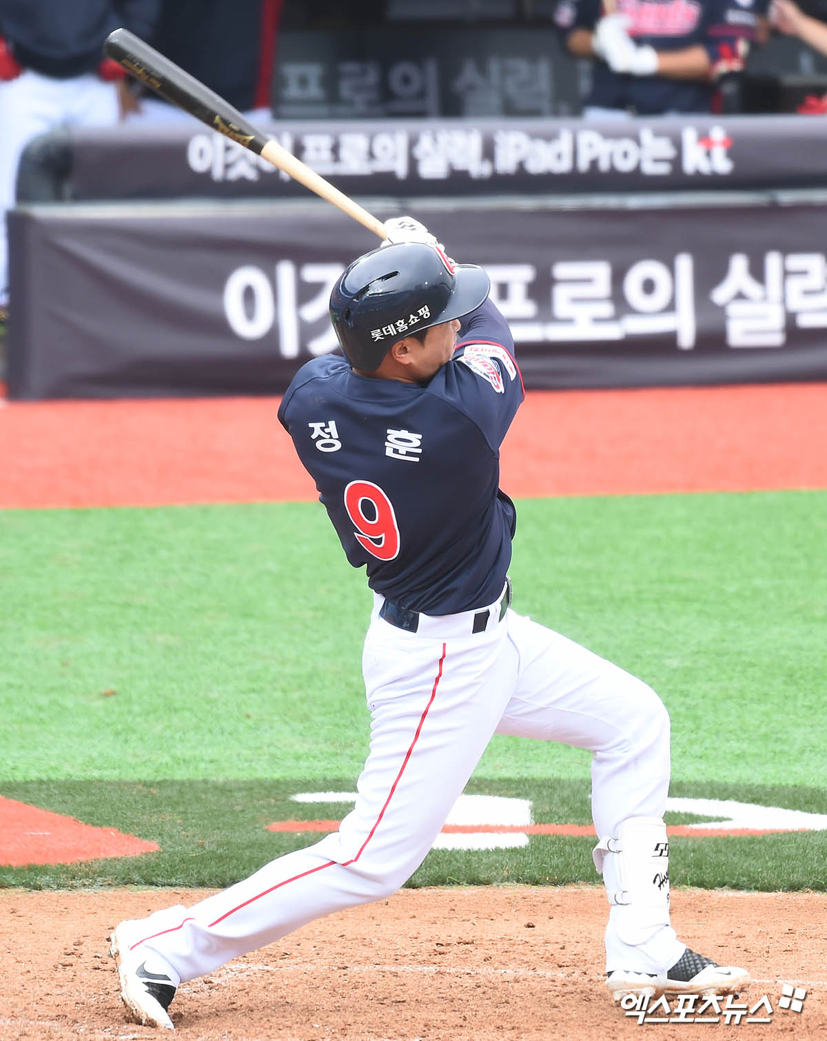 [엑스포츠뉴스 수원, 윤다희 기자] 5일 오후 수원kt위즈파크에서 열린 ‘2020 신한은행 SOL KBO 리그’ 롯데 자이언츠와 kt 위즈의 개막전 경기, 5회초 롯데 정훈이 좌중간 2루타를 날리고 있다.