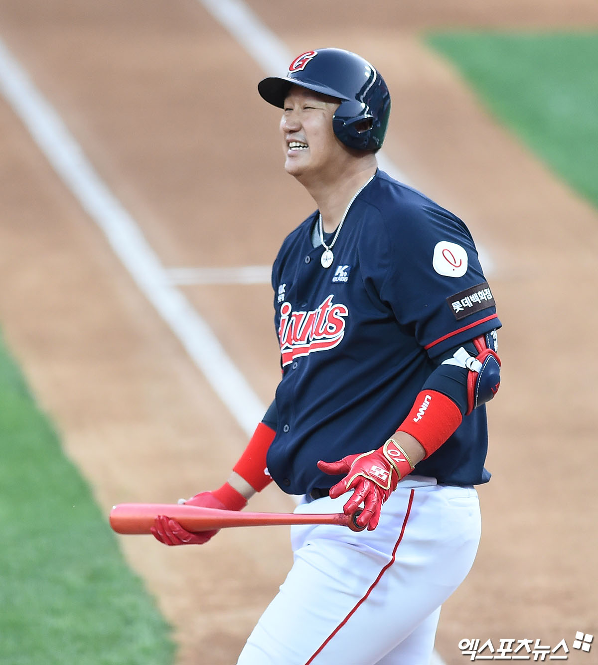 [엑스포츠뉴스 수원, 박지영 기자] 6일 오후 수원kt위즈파크에서 열린 '2020 신한은행 SOL KBO리그' 롯데 자이언츠와 kt 위즈의 경기, 1회초 2사 롯데 이대호가 헛스윙 삼진 아웃으로 물러나며 아쉬워하고 있다.