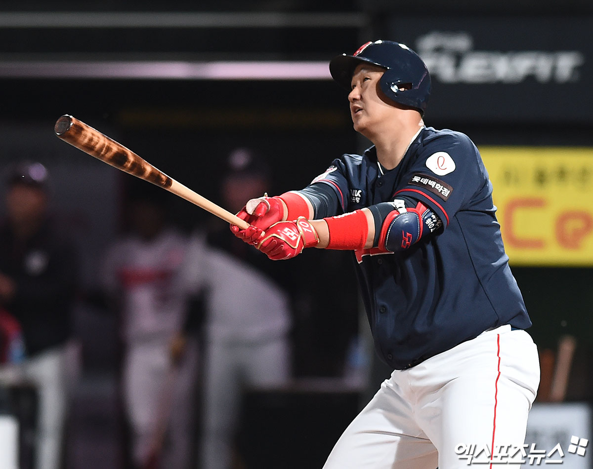 [엑스포츠뉴스 수원, 박지영 기자] 6일 오후 수원kt위즈파크에서 열린 '2020 신한은행 SOL KBO리그' 롯데 자이언츠와 kt 위즈의 경기, 7회초 1사 1,2루 롯데 이대호가 타격한 뒤 타구를 바라보고 있다. 결과는 좌익수 플라이 아웃.