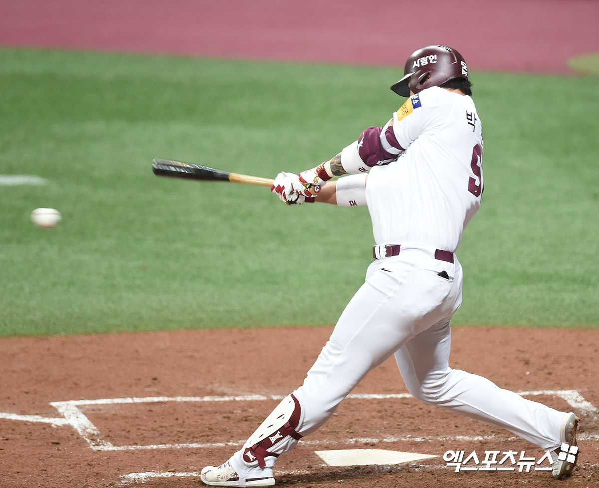 [엑스포츠뉴스 고척, 김한준 기자] 8일 오후 서울 구로구 고척스카이돔에서 열린 ‘2020 신한은행 SOL KBO 리그’ 한화 이글스와 키움 히어로즈의 경기, 5회말 1사 1,3루 키움 박병호가 1타점 적시타를 날리고 있다.