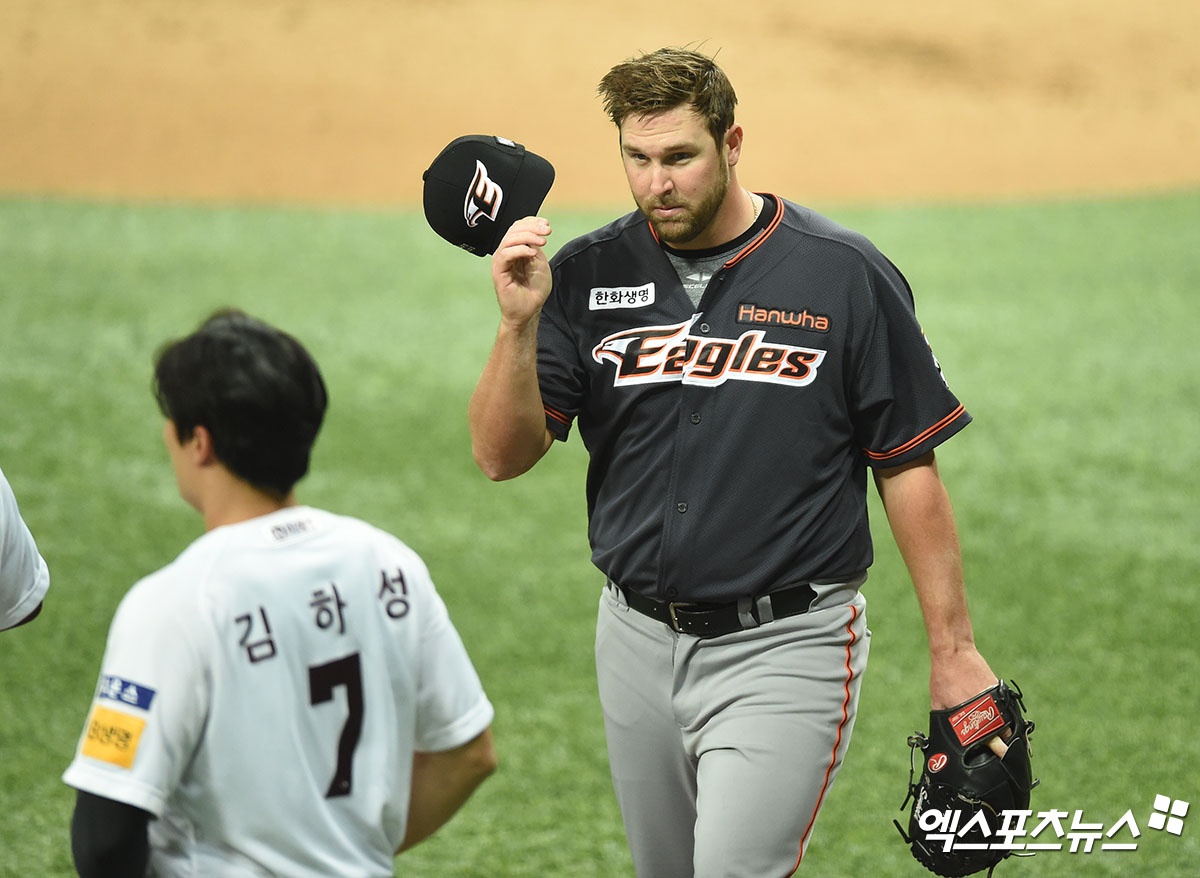 [엑스포츠뉴스 고척, 김한준 기자] 10일 오후 서울 구로구 고척스카이돔에서 열린 ‘2020 신한은행 SOL KBO 리그’ 한화 이글스와 키움 히어로즈의 경기, 1회말 수비를 마친 한화 선발투수 서폴드가 더그아웃으로 향하고 있다.