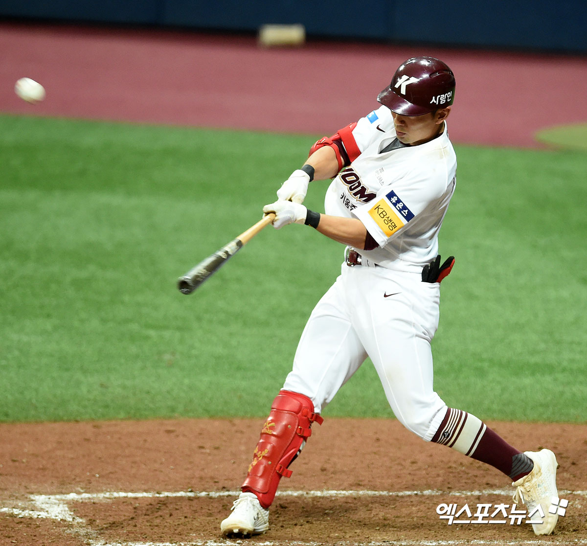 [엑스포츠뉴스 고척, 김한준 기자] 10일 오후 서울 구로구 고척스카이돔에서 열린 ‘2020 신한은행 SOL KBO 리그’ 한화 이글스와 키움 히어로즈의 경기, 7회말 무사 1,3루 키움 서건창이 역전 희생플라이를 날리고 있다.