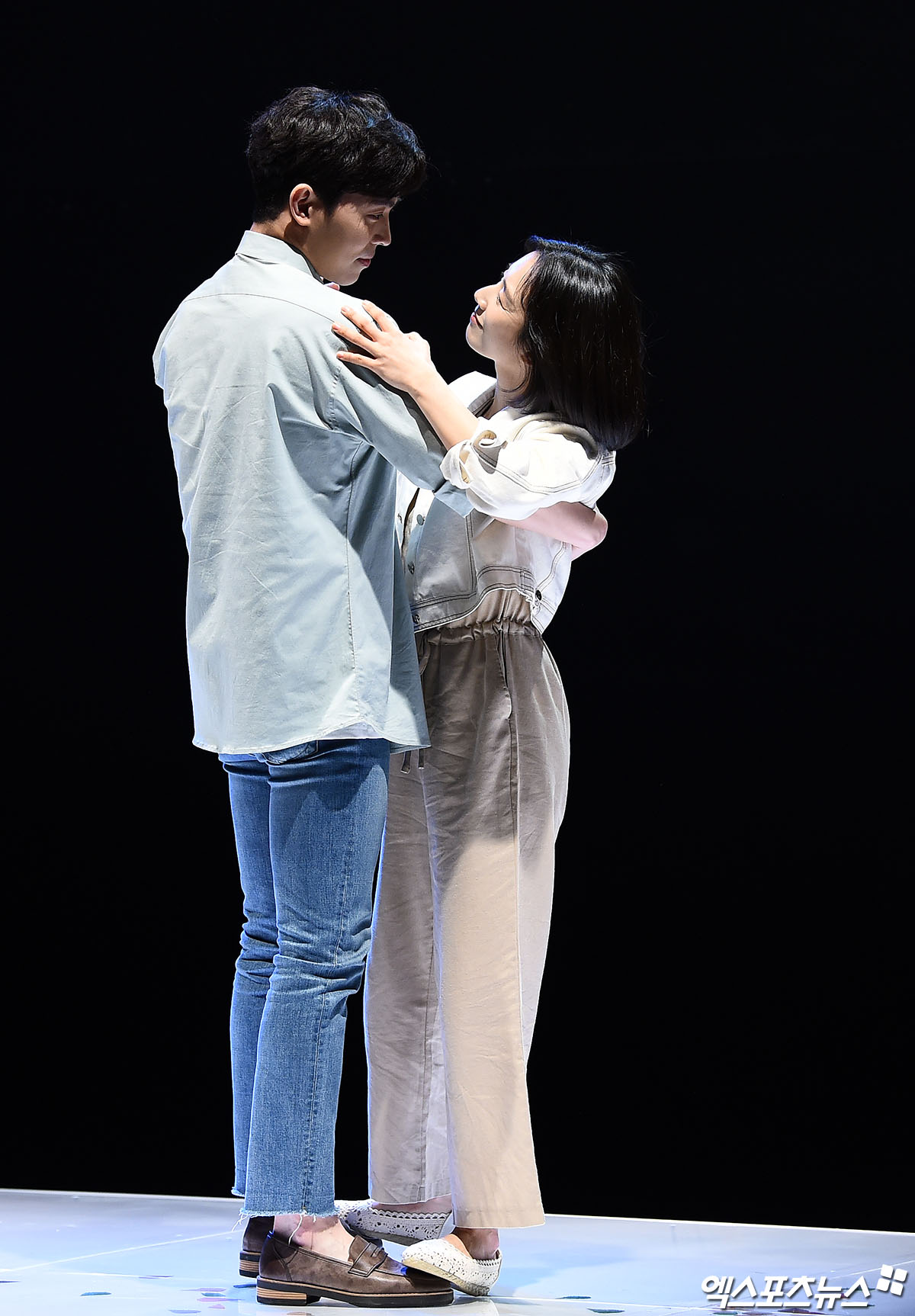 [엑스포츠뉴스 박지영 기자] 15일 오후 서울 동숭동 대학로아트원씨어터에서 열린 연극 '렁스' 프레스콜에 참석한 배우 이동하, 곽선영이 주요 장면을 시연하고 있다.