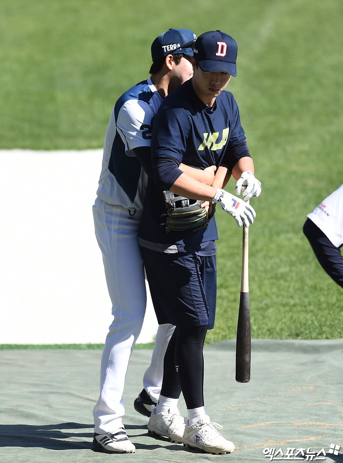 [엑스포츠뉴스 잠실, 박지영 기자] 19일 오후 서울 송파구 잠실야구장에서 열리는 '2020 신한은행 SOL KBO리그' NC 다이노스와 두산 베어스의 경기에 앞서 두산 박건우가 NC 박민우의 장난에 놀라고 있다.