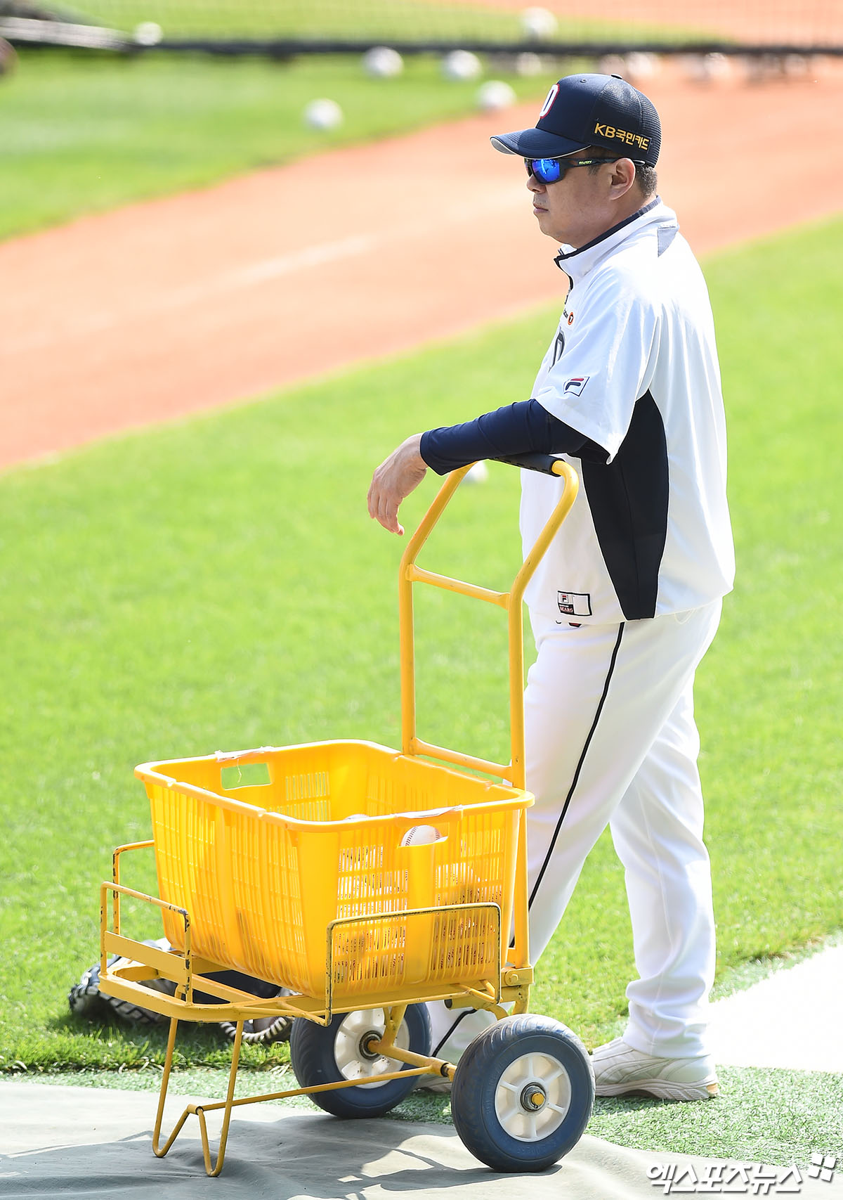 [엑스포츠뉴스 잠실, 박지영 기자] 21일 오후 서울 송파구 잠실야구장에서 열리는 '2020 신한은행 SOL KBO리그' NC 다이노스와 두산 베어스의 경기에 앞서 두산 김태형 감독이 그라운드에 나와 선수들의 훈련을 지켜보고 있다.