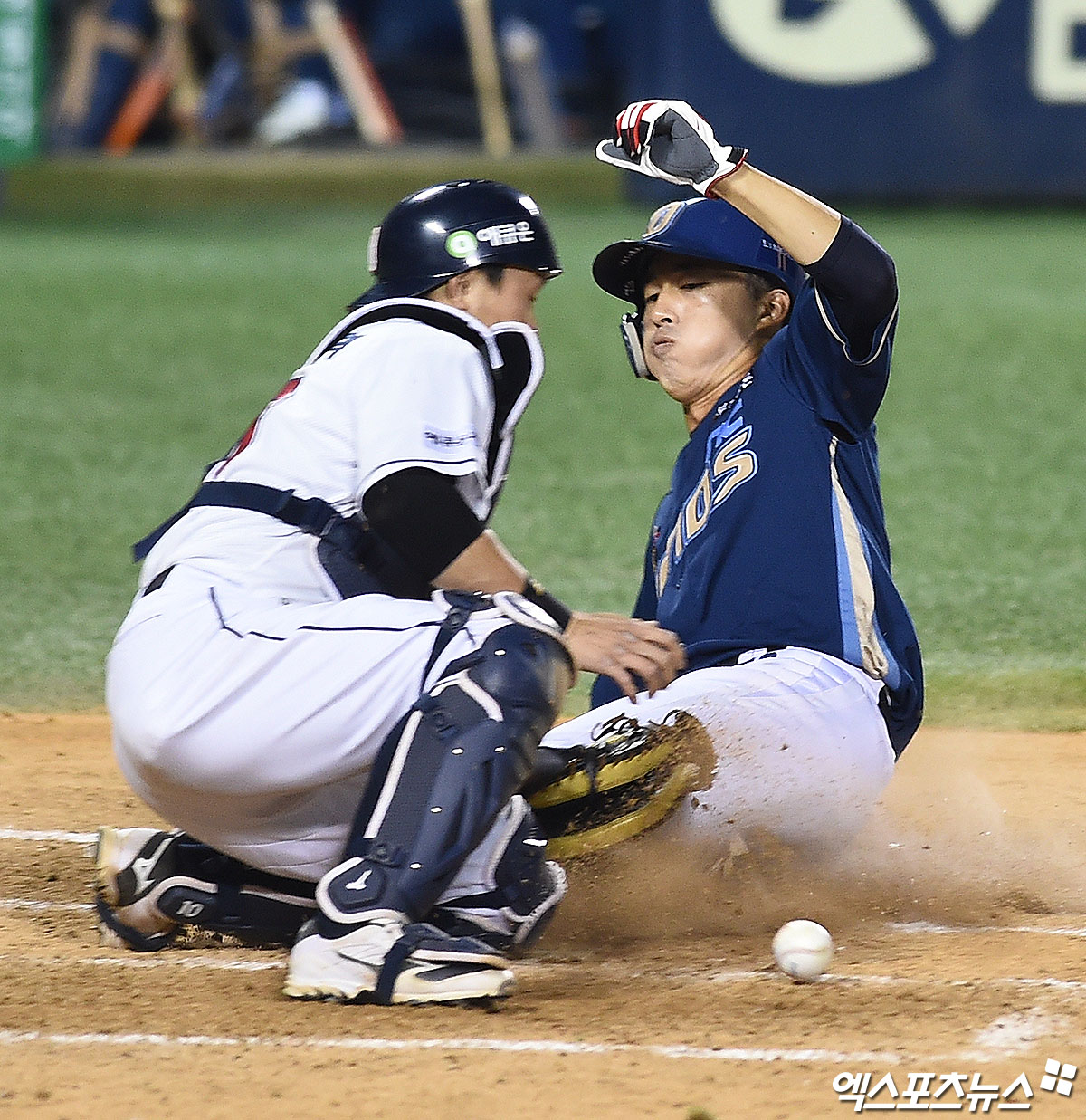 [엑스포츠뉴스 잠실, 박지영 기자] 21일 오후 서울 송파구 잠실야구장에서 열린 '2020 신한은행 SOL KBO리그' NC 다이노스와 두산 베어스의 경기, 8회초 2사 1루 NC 강진성의 1타점 적시 2루타 때 1루주자 노진혁이 홈으로 쇄도하며 득점을 올리고 있다.