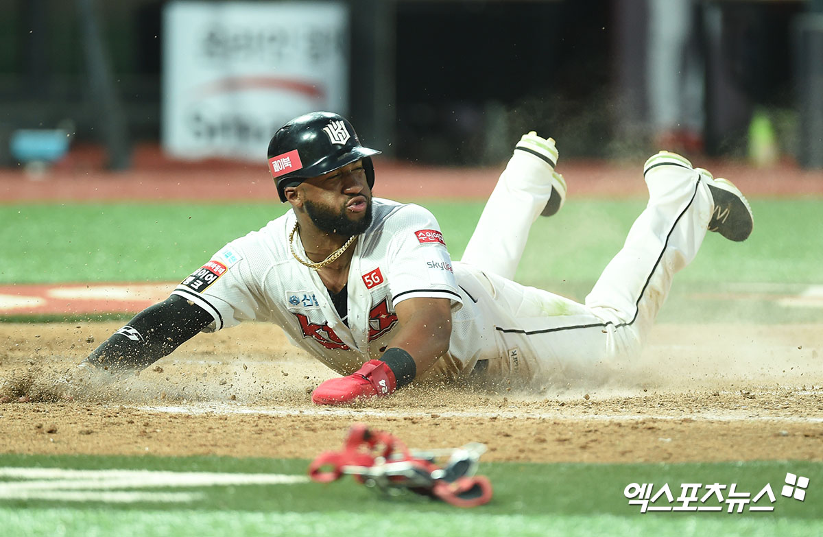 [엑스포츠뉴스 수원, 김한준 기자] 9일 오후 수원kt위즈파크에서 열린 ‘2020 신한은행 SOL KBO리그’ KIA 타이거즈와 KT 위즈의 경기, 4회말 1사 2루 KT 로하스가 장성우의 동점 적시타때 홈으로 쇄도하며 득점에 성공하고 있다.