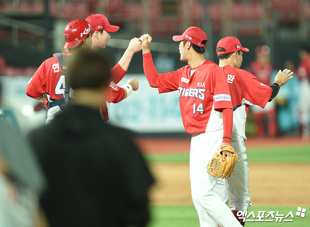 이날 경기에서 승리한 KIA 선수들이 기쁨을 나누고 있다.
