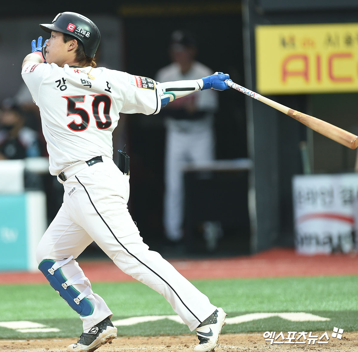 [엑스포츠뉴스 수원, 김한준 기자] 11일 오후 수원kt위즈파크에서 열린 ‘2020 신한은행 SOL KBO리그’ KIA 타이거즈와 KT 위즈의 경기, 3회말 1사 KT 강백호가 솔로 홈런을 날리고 있다.