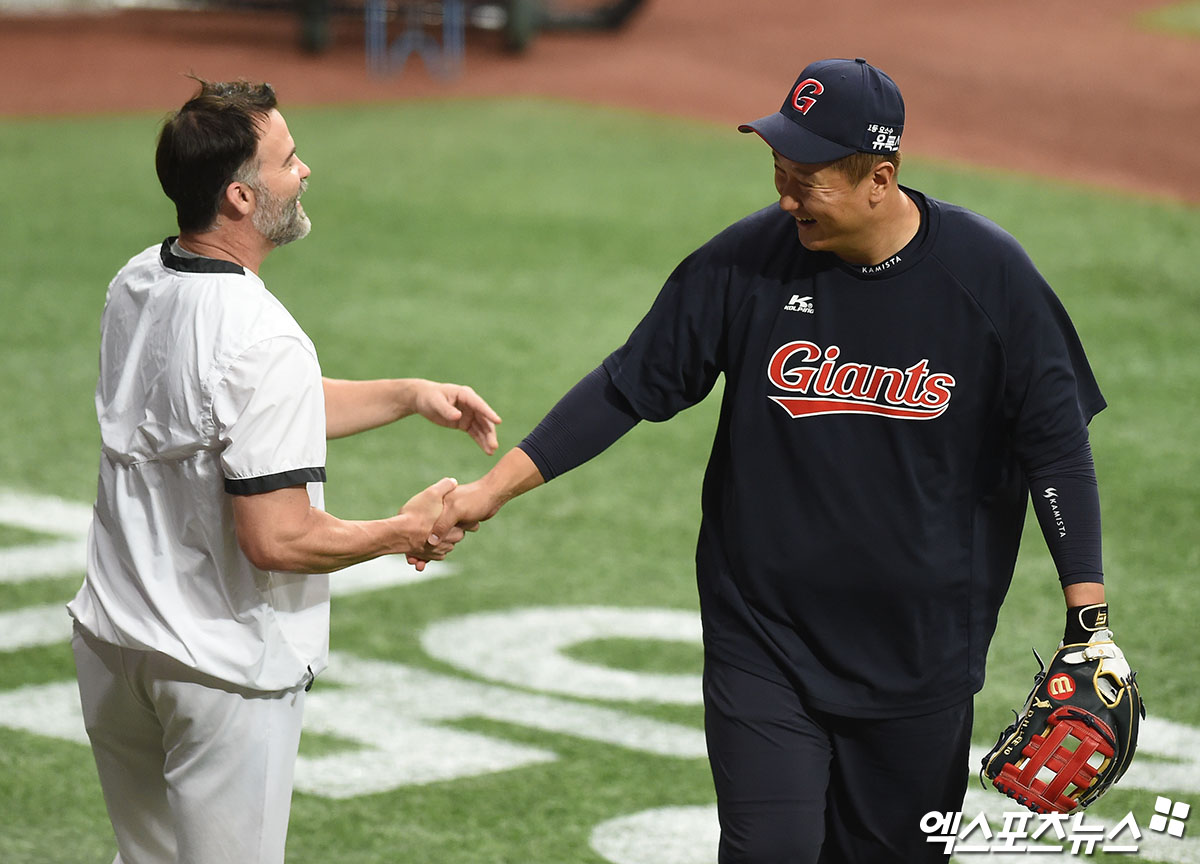 나이트 코치 '이대호와 반가운 인사'[포토]