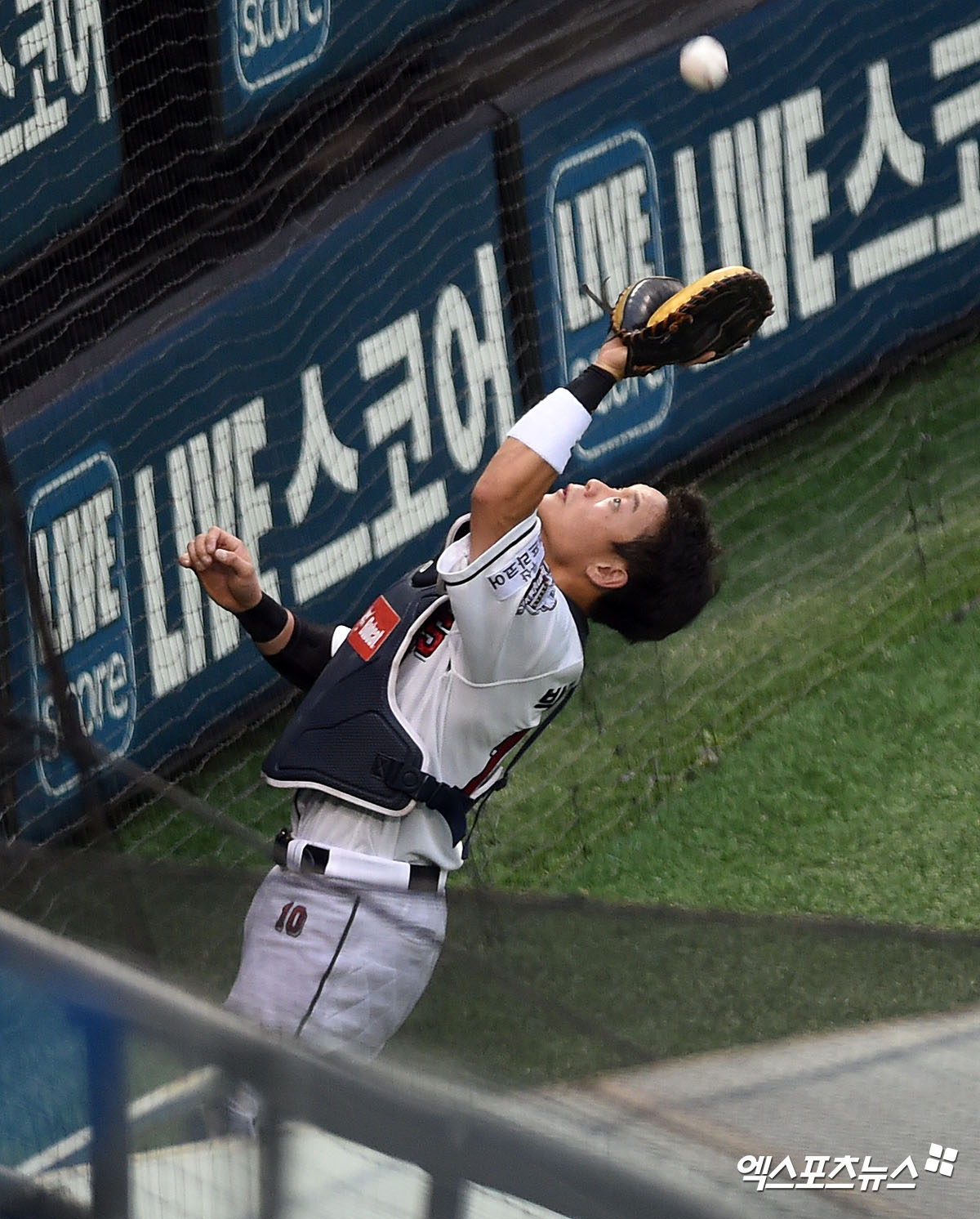 [엑스포츠뉴스 잠실, 김한준 기자] 17일 오후 서울 송파구 잠실야구장에서 열린 ‘2020 신한은행 SOL KBO리그’ 삼성 라이온즈와 두산 베어스의 경기, 3회초 두산 박세혁이 삼성 김상수의 파울 타구를 잡아내고 있다.