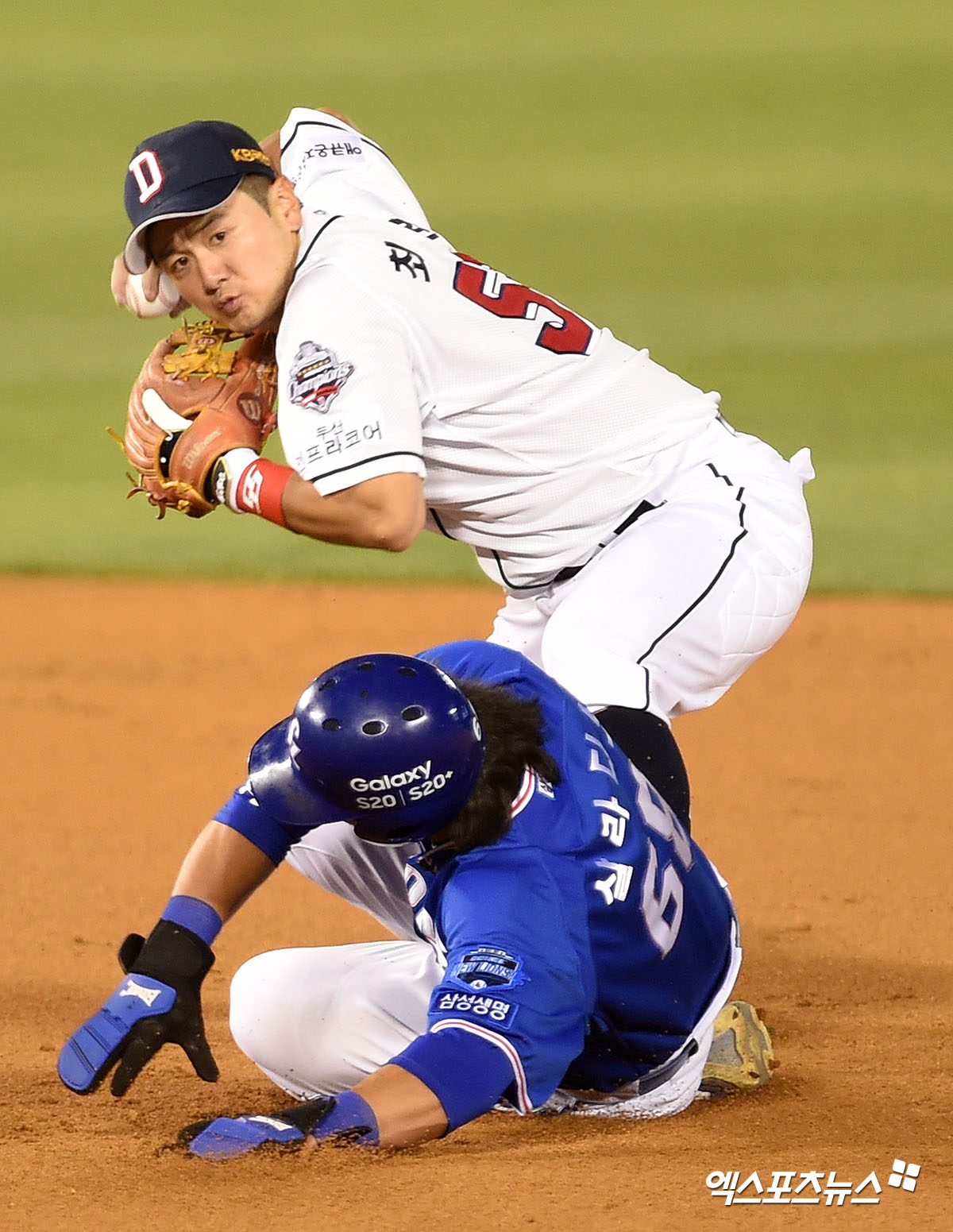 [엑스포츠뉴스 잠실, 김한준 기자] 17일 오후 서울 송파구 잠실야구장에서 열린 ‘2020 신한은행 SOL KBO리그’ 삼성 라이온즈와 두산 베어스의 경기, 7회초 1사 1,2루 두산 최주환이 삼성 이원석의 내야땅볼때 살라디노를 포스아웃 시킨 후 1루로 송구하고 있다.