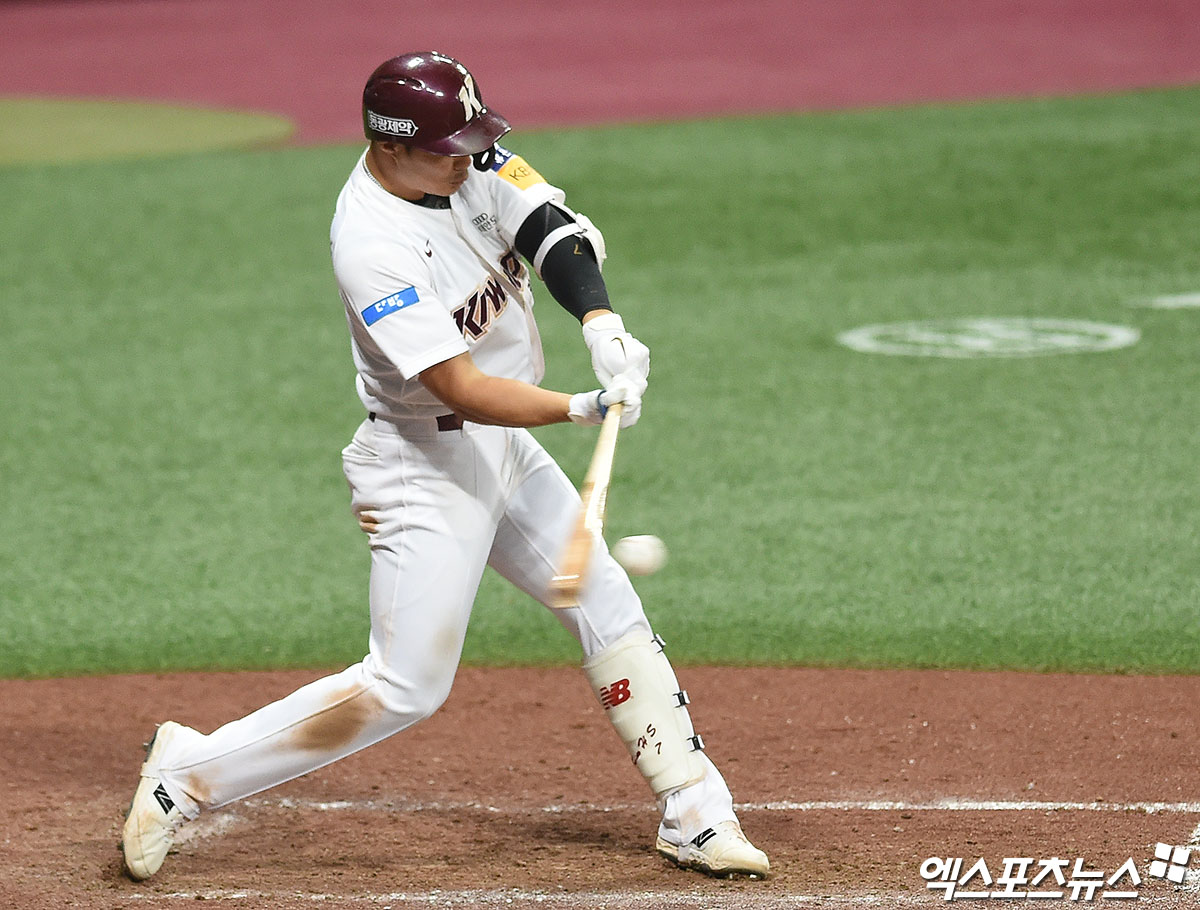 [엑스포츠뉴스 고척, 박지영 기자] 17일 오후 서울 고척스카이돔에서 열린 '2020 신한은행 SOL KBO리그' 롯데 자이언츠와 키움 히어로즈의 경기, 8회말 무사 3루 키움 김하성이 동점 적시타를 때려내고 있다.