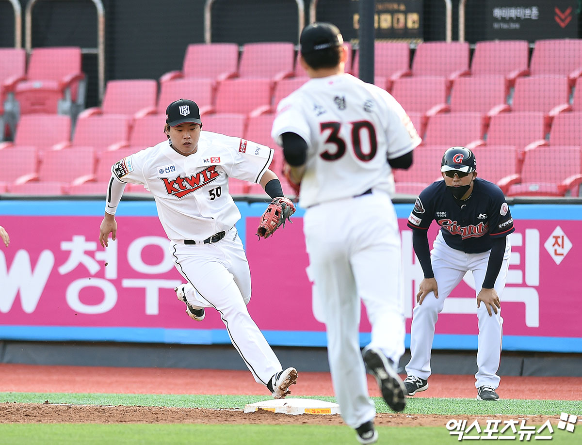 [엑스포츠뉴스 수원, 박지영 기자] 20일 오후 수원KT위즈파크에서 열린 '2020 신한은행 SOL KBO리그' 롯데 자이언츠와 KT 위즈의 경기, 3회초 KT 1루수 강백호가 롯데 선두타자 손아섭의 땅볼 타구를 잡아 1루에서 터치아웃을 잡아내고 있다.