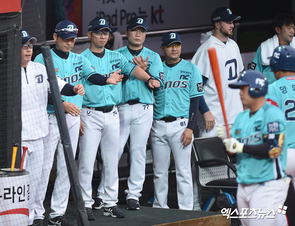 [엑스포츠뉴스 수원, 김한준 기자] 23일 오후 수원kt위즈파크에서 열린 ‘2020 신한은행 SOL KBO리그’ NC 다이노스와 KT 위즈의 경기, 1회초 1사 1,3루 NC 양의지가 1타점 희생플라이 타구를 날린 후 코칭스태프들에게 박수를 받고 있다.