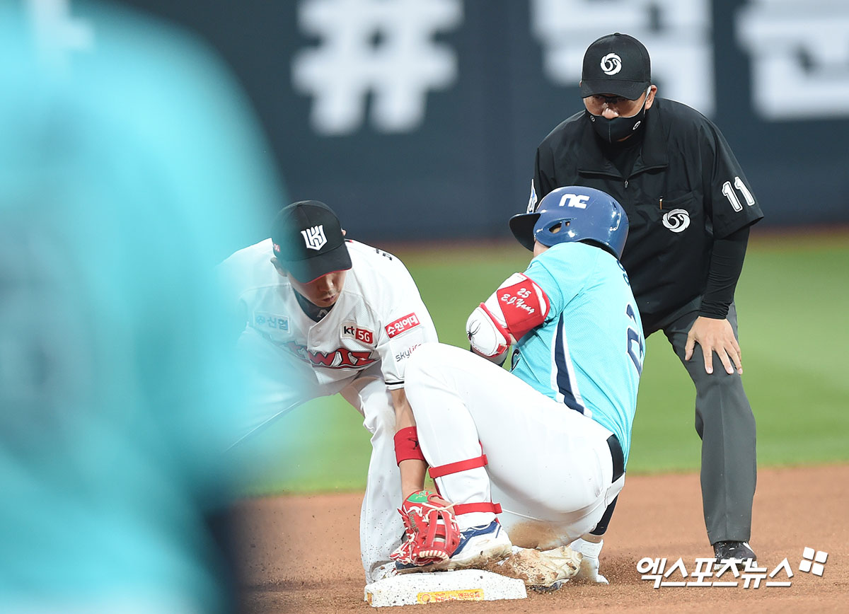[엑스포츠뉴스 수원, 김한준 기자] 23일 오후 수원kt위즈파크에서 열린 ‘2020 신한은행 SOL KBO리그’ NC 다이노스와 KT 위즈의 경기, 4회초 1사 NC 양의지가 안타를 날린 후 2루까지 진루하고 있다.
