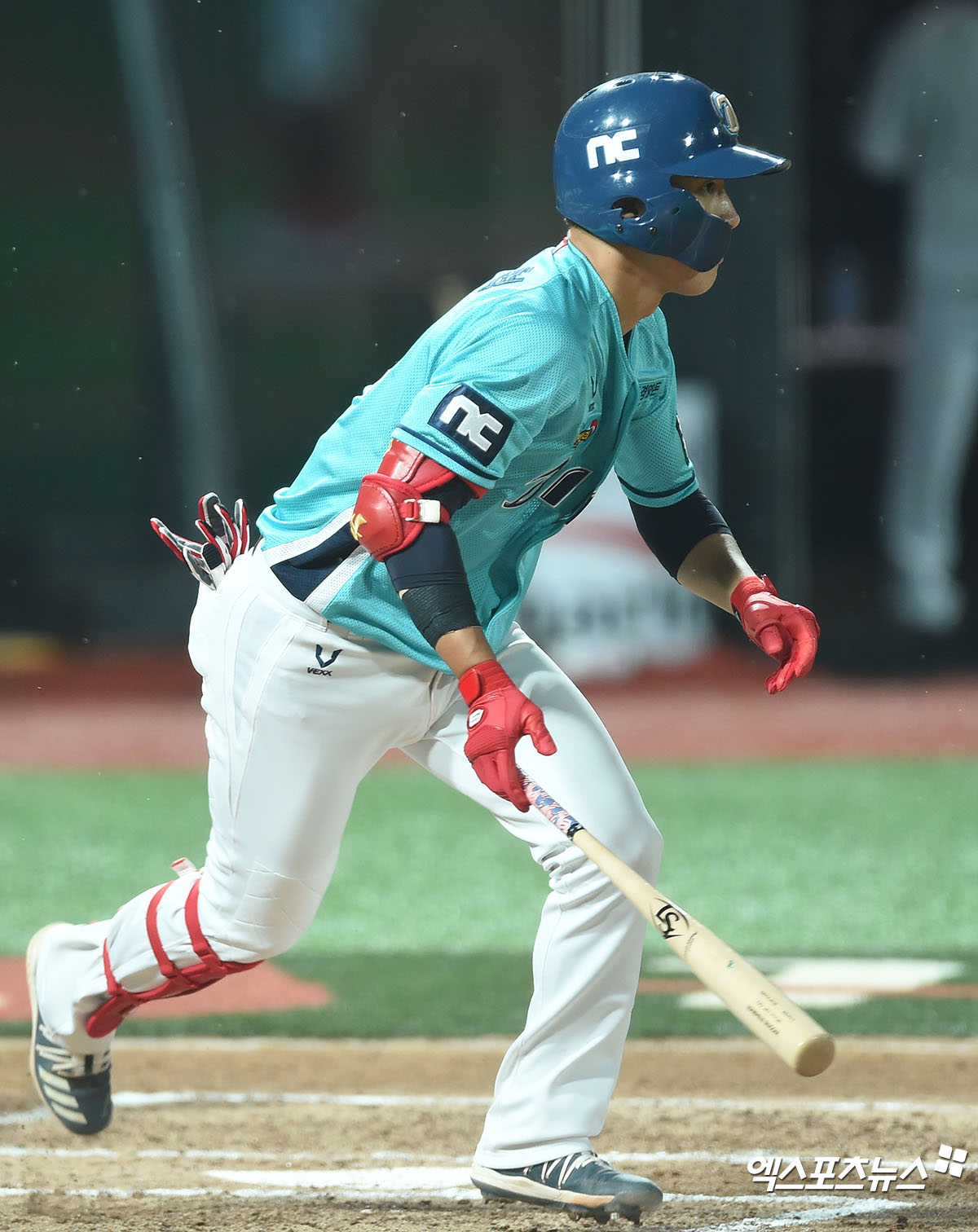 [엑스포츠뉴스 수원, 김한준 기자] 23일 오후 수원kt위즈파크에서 열린 ‘2020 신한은행 SOL KBO리그’ NC 다이노스와 KT 위즈의 경기, 6회초 1사 3루 NC 노진혁이 1타점 적시타를 날리고 있다.