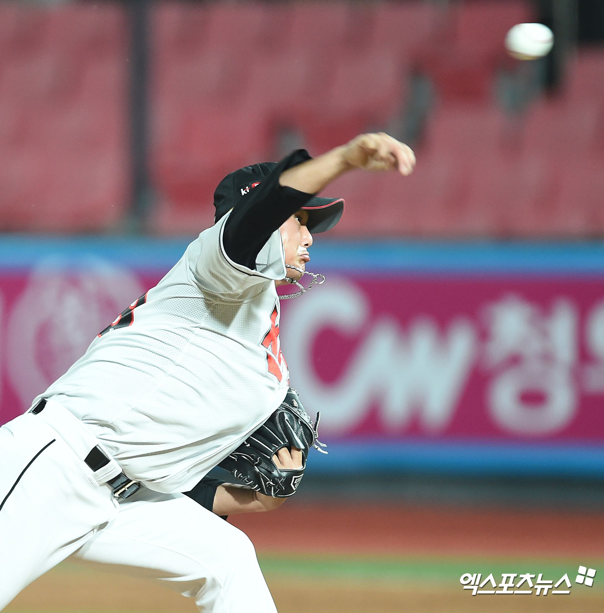 [엑스포츠뉴스 수원, 김한준 기자] 23일 오후 수원kt위즈파크에서 열린 ‘2020 신한은행 SOL KBO리그’ NC 다이노스와 KT 위즈의 경기, 7회초 KT 주권이 공을 힘차게 던지고 있다.