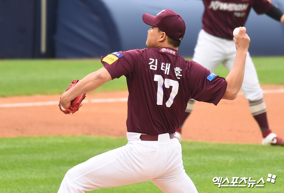 [엑스포츠뉴스 잠실, 윤다희 기자] 25일 오후 서울 송파구 잠실야구장에서 열린 ‘2020 신한은행 SOL KBO 리그’ 키움 히어로즈와 LG 트윈스의 더블헤더 1차전 경기, 6회말 키움 김태훈이 역투하고 있다.