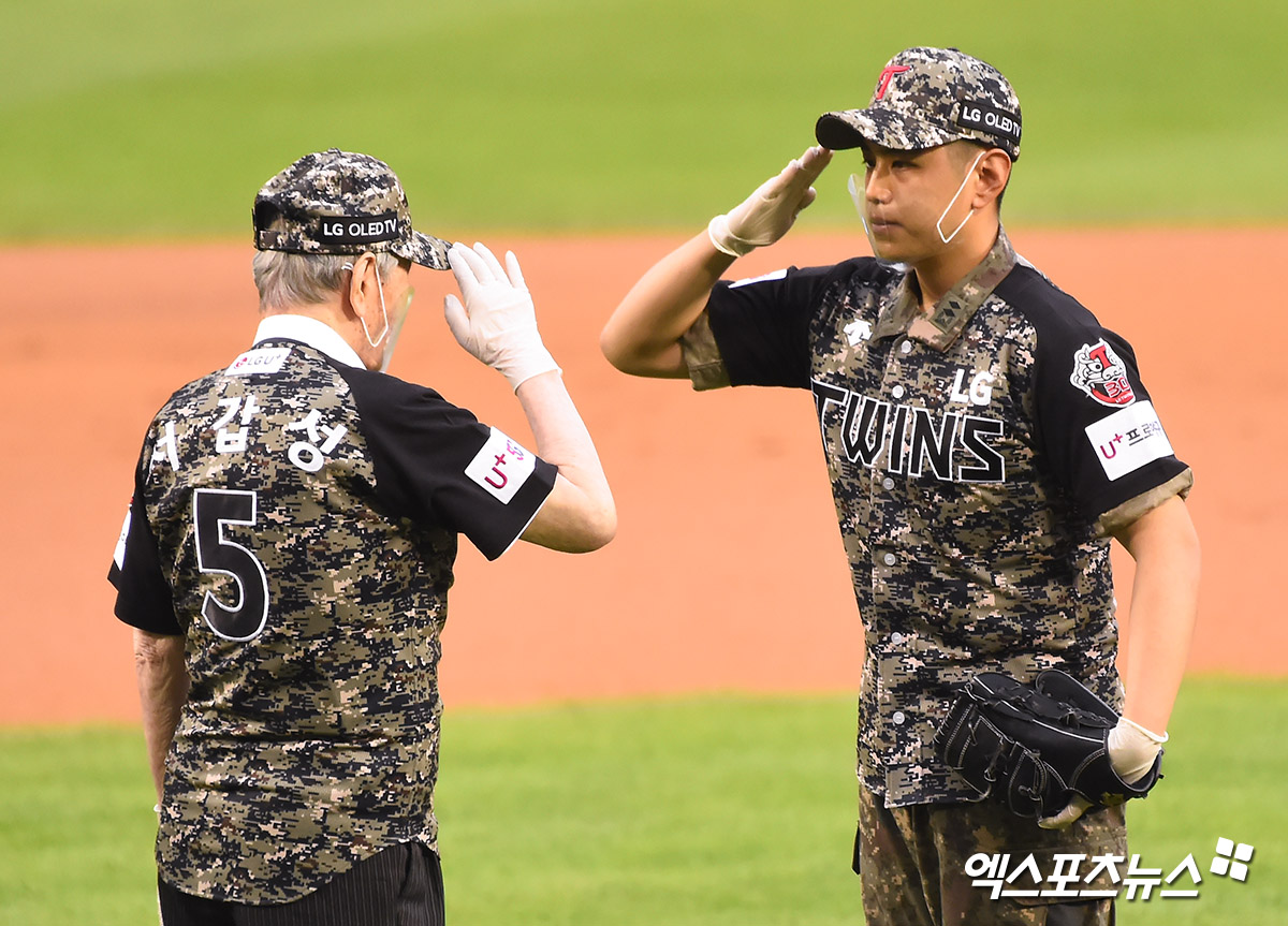 [엑스포츠뉴스 잠실, 윤다희 기자] 25일 오후 서울 송파구 잠실야구장에서 열린 ‘2020 신한은행 SOL KBO 리그’ 키움 히어로즈와 LG 트윈스의 더블헤더 2차전 경기에 앞서 6.25전쟁 참전유공자 서갑성 옹(95세)과 육군 5사단 소속 소대장 배홍성 중위가 시구를 선보이고 있다.