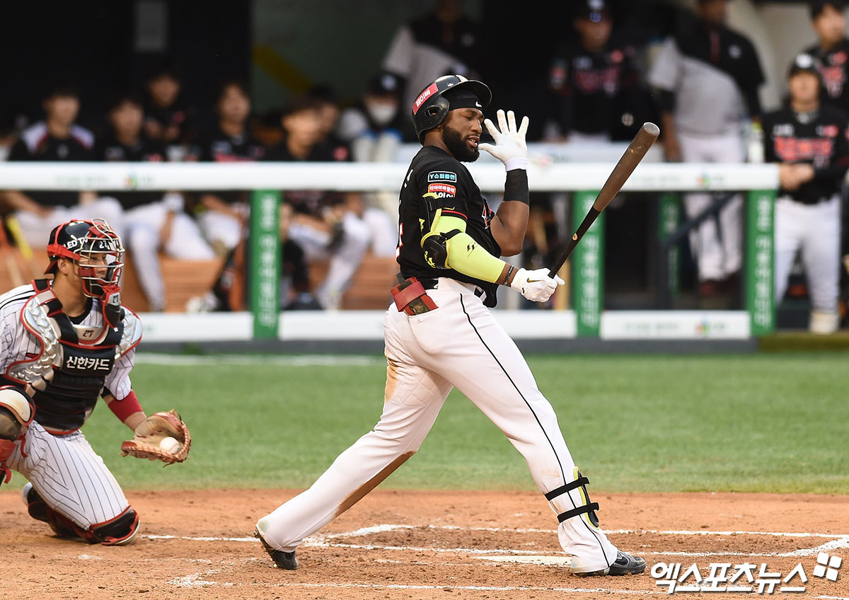[엑스포츠뉴스 잠실, 박지영 기자] 30일 오후 서울 송파구 잠실야구장에서 열린 '2020 신한은행 SOL KBO리그' KT 위즈와 LG 트윈스의 경기, 3회초 1사 1루 KT 로하스가 헛스윙을 하고 있다.