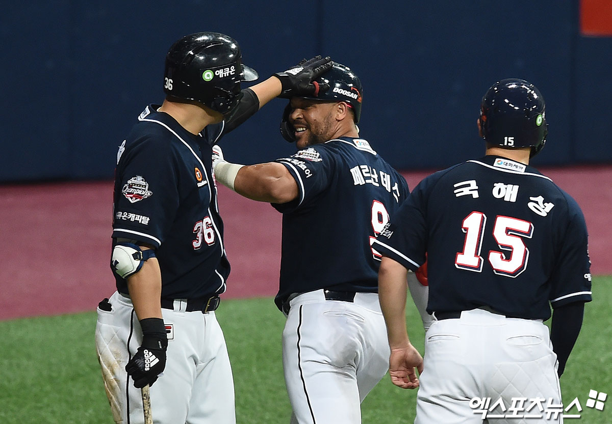 [엑스포츠뉴스 고척, 박지영 기자] 1일 오후 서울 구로구 고척스카이돔에서 열린 '2020 신한은행 SOL KBO리그' 두산 베어스와 키움 히어로즈의 경기, 7회초 2사 2루 두산 페르난데스가 투런 홈런을 때려낸 뒤 홈에서 대기타석의 오재일과 장난을 치고 있다.